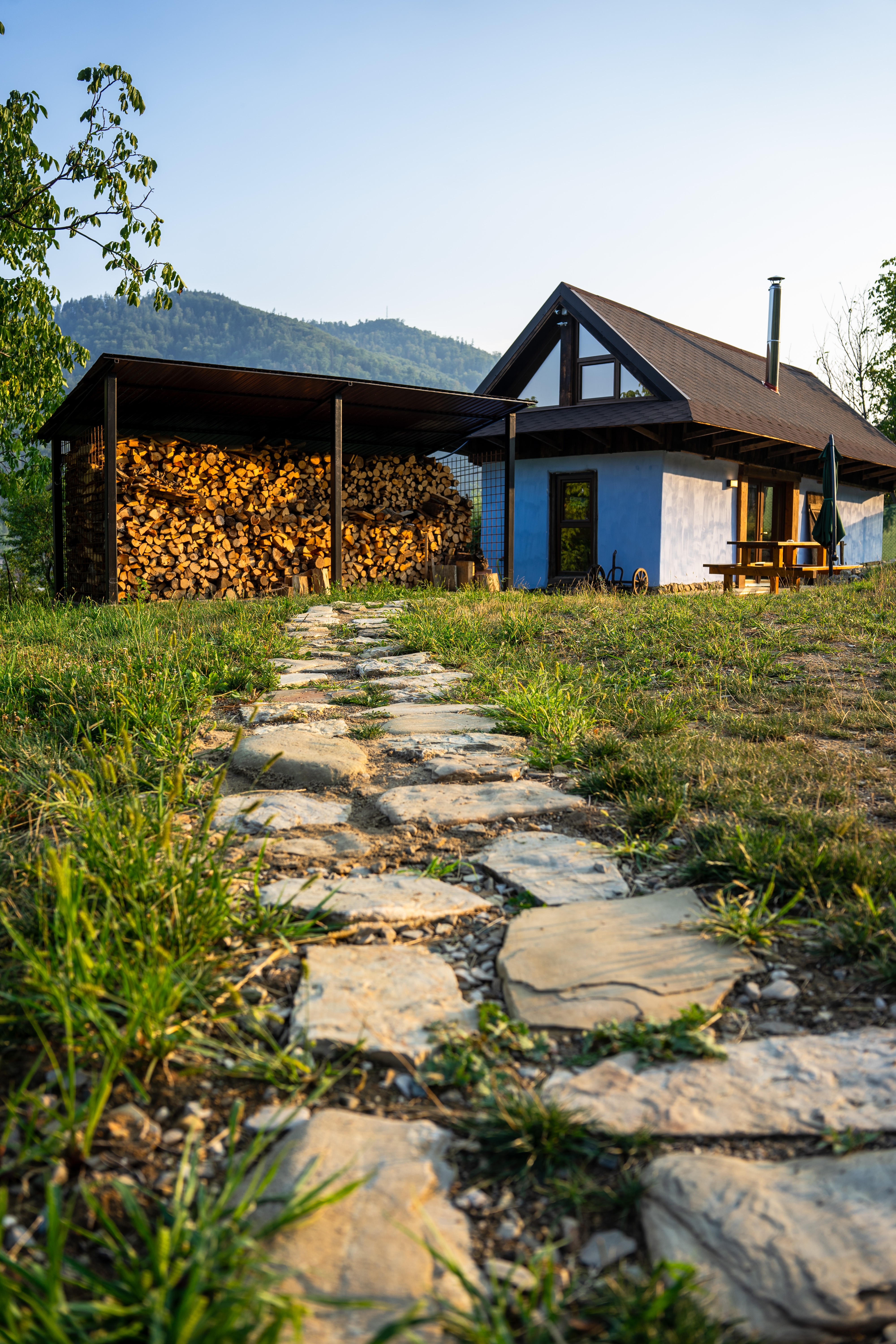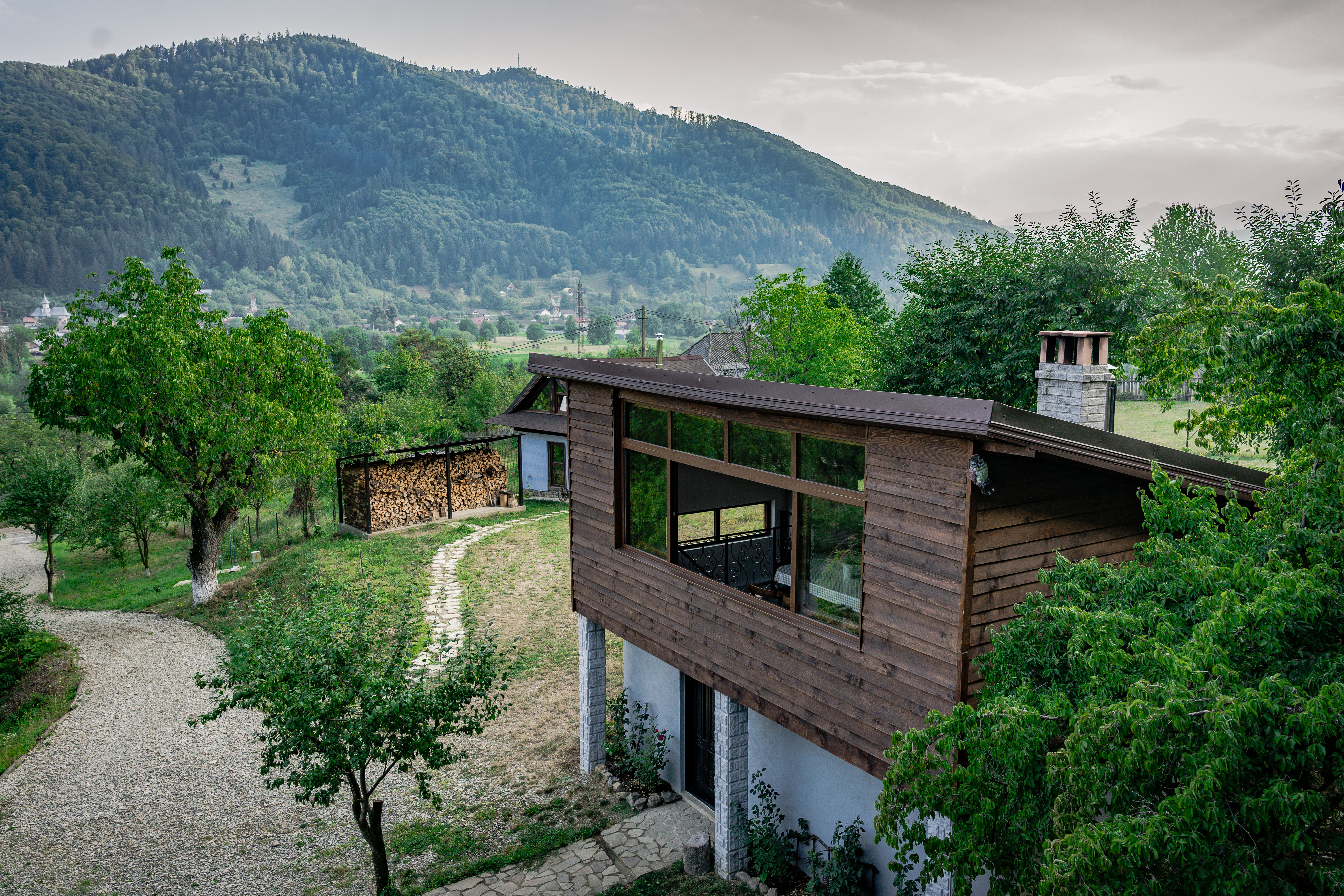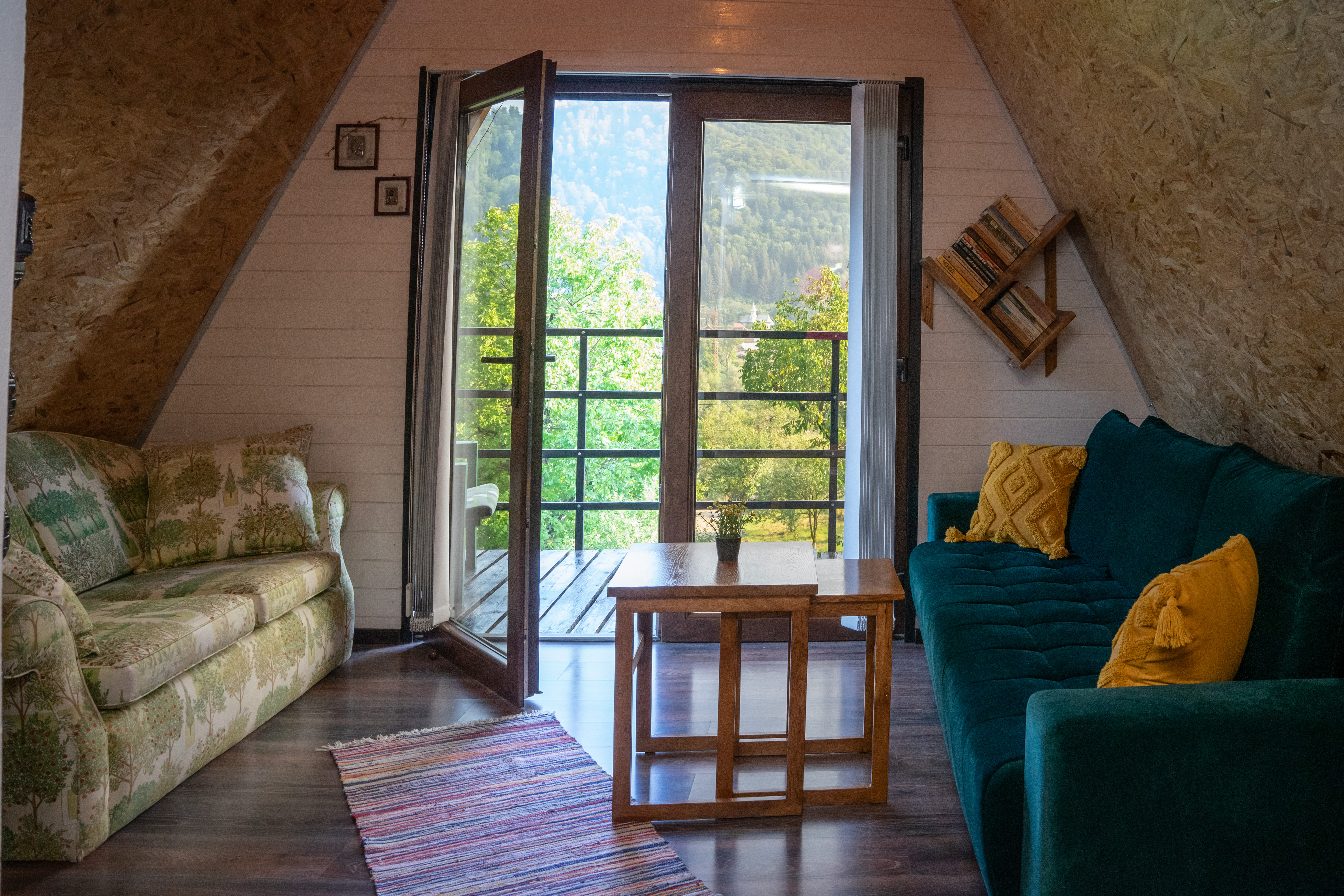 A-Frame are o suprafață de 40 metri pătrați, cu o canapea extensibilă și pat dublu la mansardă. Baie complet utilată și șemineu.
